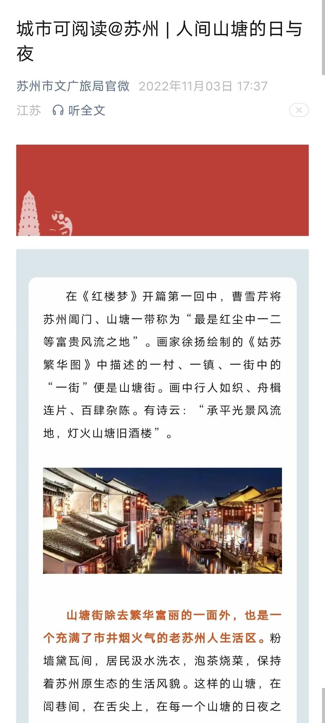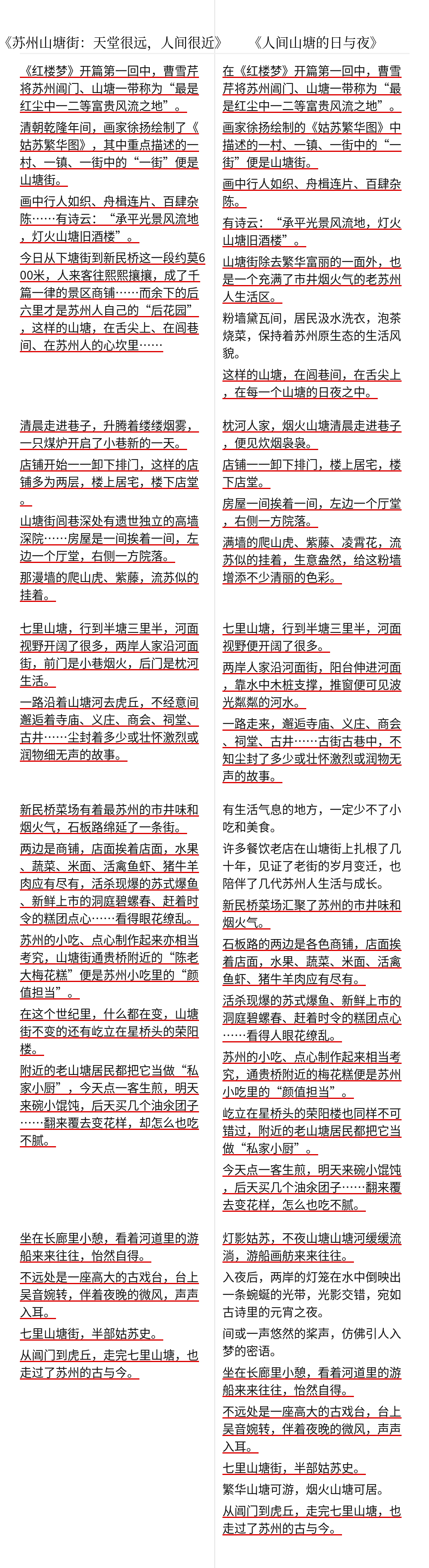 记者对比《苏州山塘街:天堂很远,人间很近》及苏州文旅微信公众号发布的《城市可阅读@苏州丨人间山塘的日与夜》两篇文章,发现确有大段文字雷同乃至完全一致。